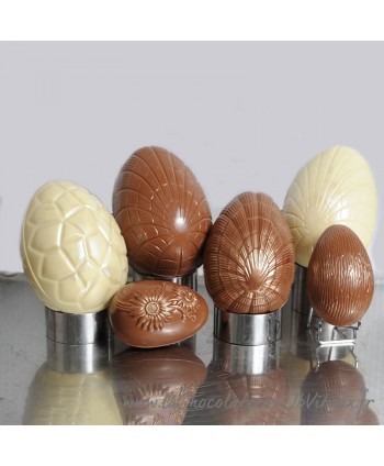 Œuf petit "Edelweiss" ou "strié" en chocolat noir, lait ou blanc garni de friture sèche, friture fourrée pralinée, et petits œufs colorés.
