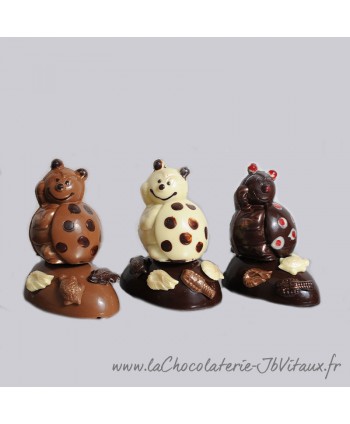 Coccinelle en chocolat noir, lait ou blanc garni de friture sèche, friture fourrée pralinée, et petits œufs colorés.