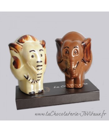 Eléphant en chocolat noir, lait ou blanc garni de friture sèche, friture fourrée pralinée, et petits œufs colorés.